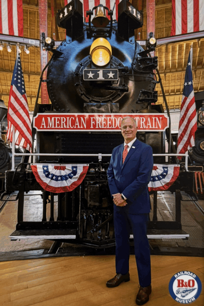 RSI President Jim Riley (above) reported via LinkedIn: “Thank you to Kris Hoellen and the rest of the team at the B&O Railroad Museum for inviting the Railway Supply Institute (RSI) to attend the unveiling of the refurbished American Freedom Train as part of the America 250 celebration. It was an honor to represent the railway supply industry at this event. I remember my parents bringing me to see the American Freedom Train for the Bicentennial when I was a kid and it was confirmed for me today that this was the same locomotive that I saw 50 years ago.” (Courtesy of Jim Riley, RSI)