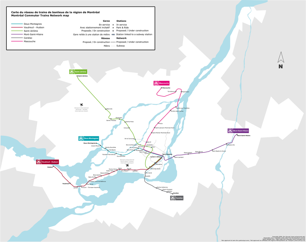 Montreal has commuter rail lines, too and, in that city’s case, the description fits. The Deux-Montagnes line, which will become an REM line, was the busiest. Service is strong during traditional peak commuting hours, but much more limited at other times on the five remaining lines. They radiate from downtown in different directions: to Vaudreuil (west, with a single train going one more stop to Hudson), Saint-Jérôme (northwest), Candiac (southeast), Mascouche (north), and Mont Saint-Hilaire (northeast, toward Quebec City). The first three lines run on Canadian Pacific (CP, now part of CPKC) track from Lucien-L’Allier Station, near the location of CP’s former and historic Windsor Station. The other two run on CN, from Central Station, home of VIA Rail and the REM Line. Trains first ran on the line to Saint-Hillaire in 1859 and on the historic CP lines during the 1880s. The most recent start is the Mascouche Line, which started service in 2014, using Bombardier MultiLevel cars and ALP-45DP dual-power locomotives, virtually identical to those in use on New Jersey Transit. This equipment is now used on all lines. EMD F59PH locomotives from 1990 and F59PHI units from 2000 are also in use on the historic CP lines and the Mont-Saint-Hillaire line. New Siemens Charger locomotives and CRRC bilevel railcars are on order.