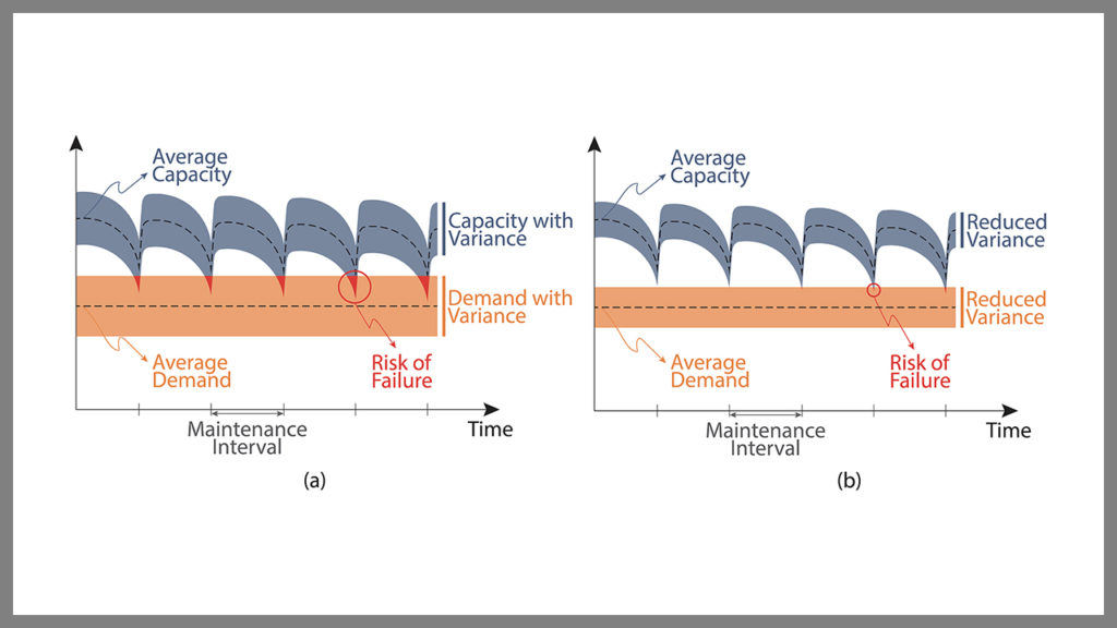 • System management policies that maintain capacity and demand ranges within target bandwidths can effectively control system failure risks by limiting the most disparate extreme value interactions between capacity and demand. In doing this, the weakest components in service are less weak and the highest demands in service are lower. This is true even when average capacity and demand values do not change.