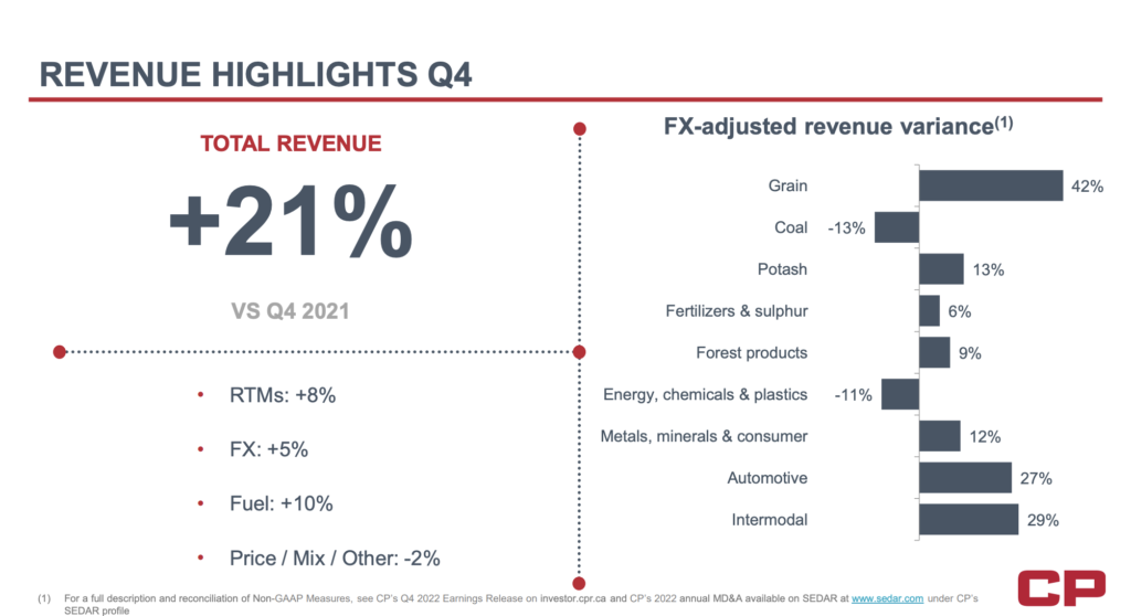 “Carloads grew 9% in the quarter, driven by a blockbuster grain crop (top five in Canadian history) that led to 24% volume growth, partially offset by a 16% decline in coal volumes, which was due to a longer than anticipated plant outage that caused more than 100 trainloads to be lost. Automotive carloads increased 11% as the auto parts shortage is starting to see material improvement, as well as new Ford business; there is a lot more inventory replenishment to do as car dealerships continue to restock in 2023.