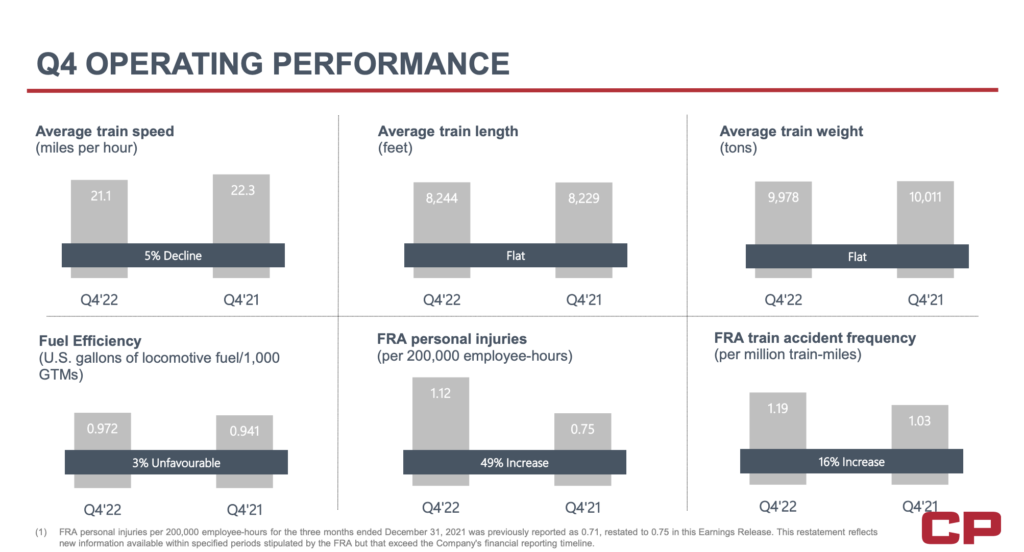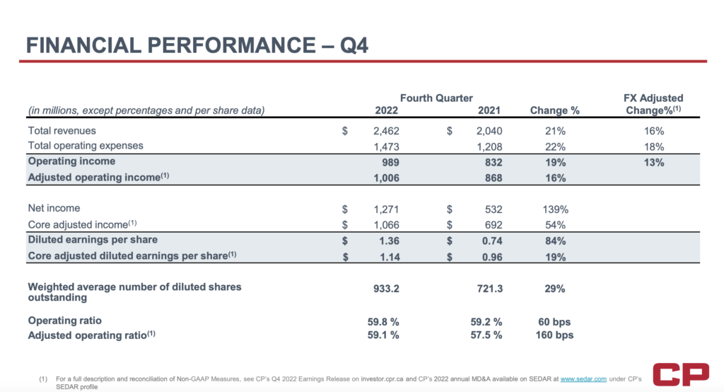 “CP posted adjusted diluted EPS of C$1.14 in 4Q22, above our C$1.05 CAD estimate and C$1.06 consensus figure. The adjusted. OR worsened 160bps in 4Q22, with the full year OR at 61.4% compared to 57.6% in 2021. Revenues grew 21% in 4Q22, with a 5% FX (foreign Exchange) tailwind and 10% fuel surcharge recovery bump.