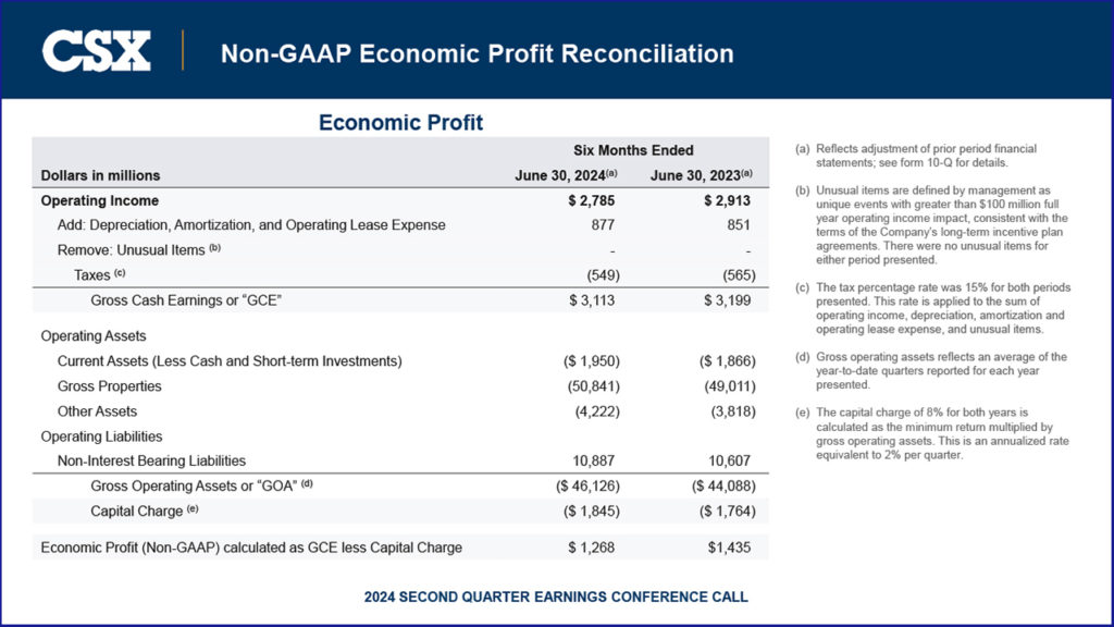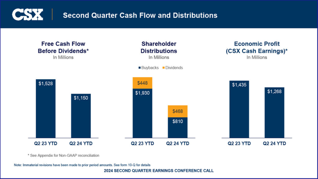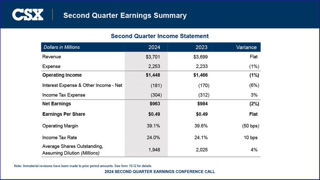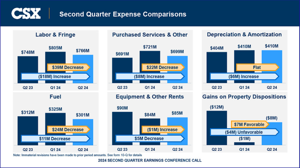 • Operating income of $1.45 billion decreased 1% compared to the same period in 2023 while increasing 8% from 1Q24. CSX’s 2Q24 operating ratio was 60.9% (CSX called it a ”39.1% Operating Margin”), increasing 50 basis points year-over-year but decreasing 280 basis points sequentially.
