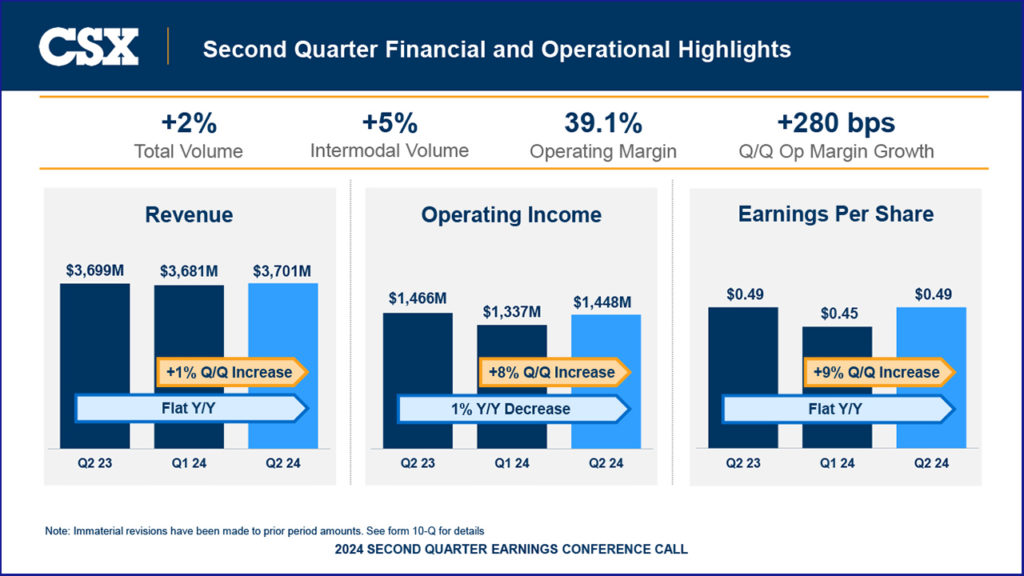 “CSX remained focused on efficiently serving our customers over the second quarter, allowing us to deliver strong sequential increases in volume, operating income, margin, and earnings per share,” said President and CEO Joe Hinrichs. “I am proud of our railroad’s performance, including our team’s effective response to the disruptions at the Port of Baltimore. As we continue to execute through shifting markets, CSX is well-positioned to achieve solid year-over-year margin expansion over the remainder of 2024.”