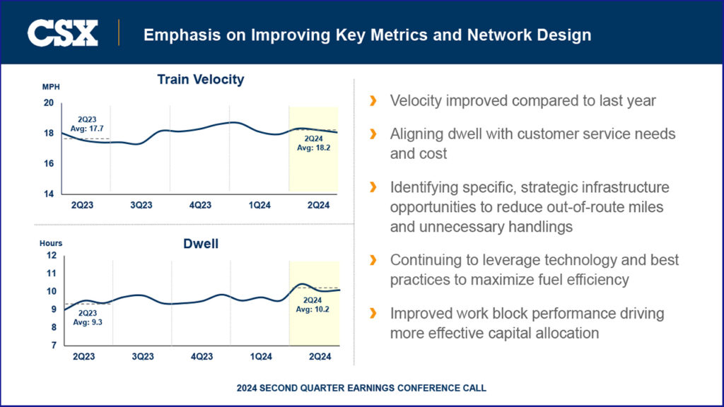Network velocity improved compared 2Q23, as CSX is “aligning dwell with customer service needs and cost, “identifying specific, strategic infrastructure opportunities to reduce out-of-route miles and unnecessary handlings and continuing to leverage technology and best practices to maximize fuel efficiency,” Cory said. “Improved work block performance is driving more effective capital allocation.”