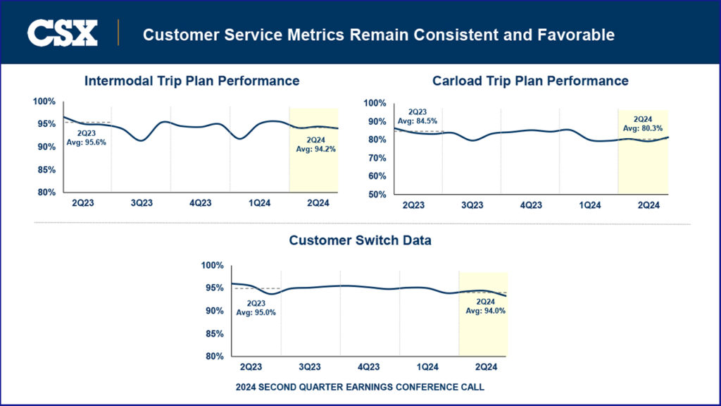 Safety-wise, CSX Executive Vice President and Chief Operating Officer Mike Cory said the FRA reportable injury rate, which increased slightly from 1.20 in 1Q24 to 1.25 in 2Q24, “is a key area of focus.” The FRA train accident rate dropped dramatically, from 4.09 in 1Q24 to 2.62, “as CSX fosters a fundamental safety culture centered on effective mentorship.” The company is launching “an extensive, three-year program aimed at strengthening our safety leadership skills and building employee engagement,” Cory noted.