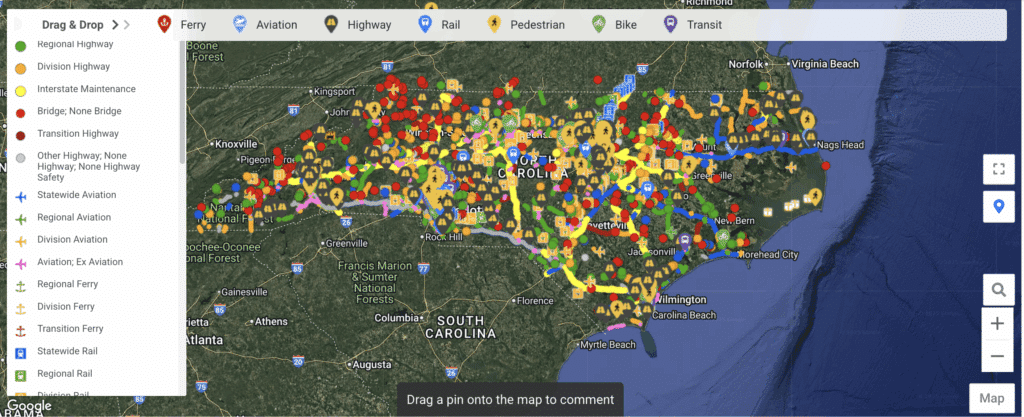 “Projects can be as large-scale as an interstate improvement or as small as a new turn lane or intersection improvement and can be for any of NCDOT’s six modes of transportation—highway, aviation, bicycle and pedestrian, ferry, public transportation and rail,” according to NCDOT, which noted that comments may not include maintenance-related projects, such as patching potholes, resurfacing, or ditches, since NCDOT uses a different method to prioritize those projects.