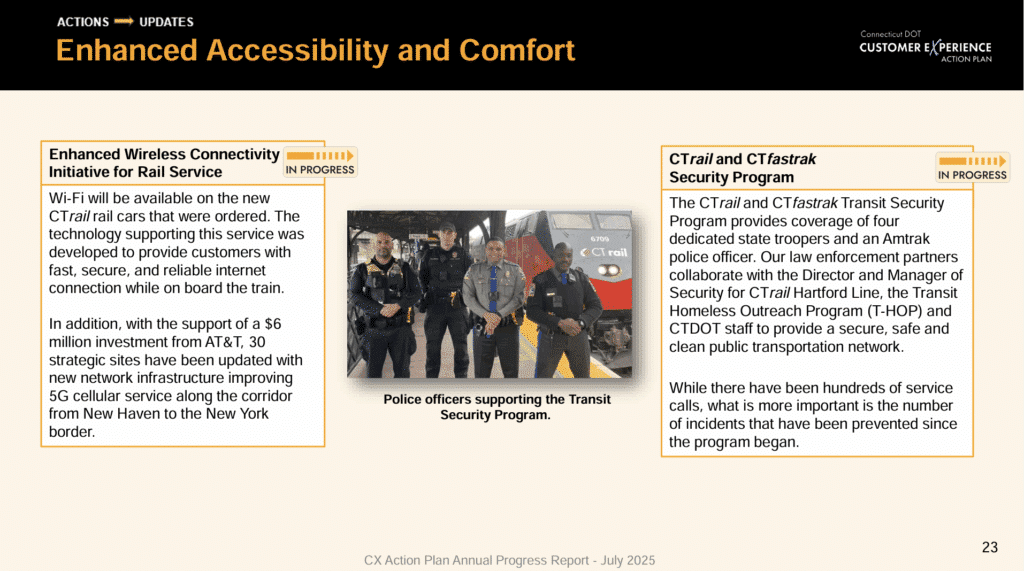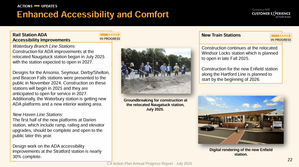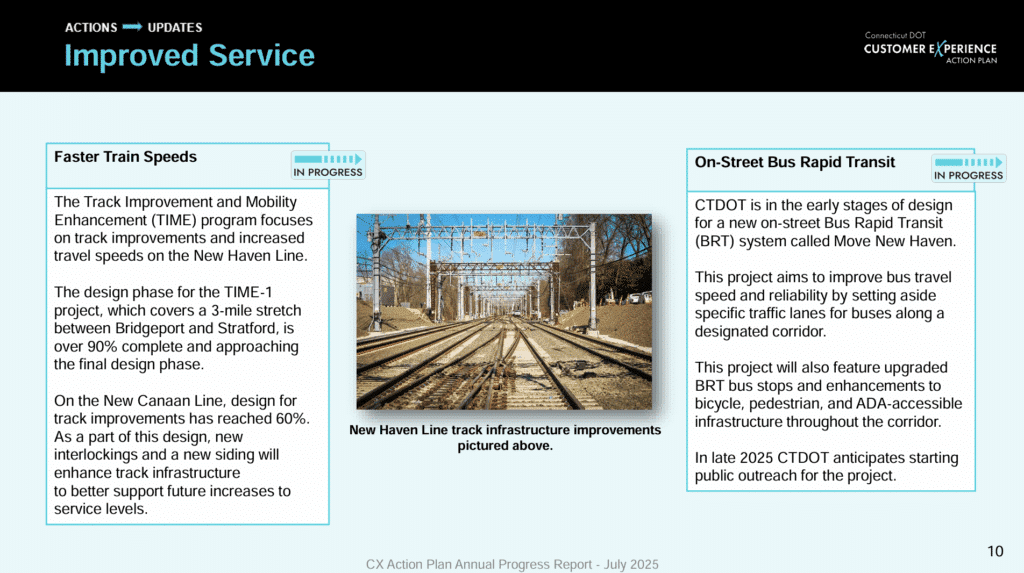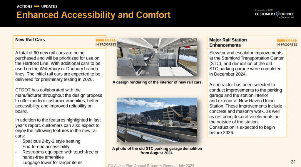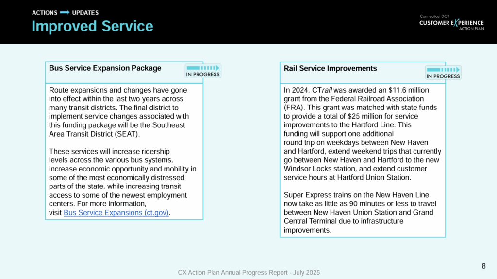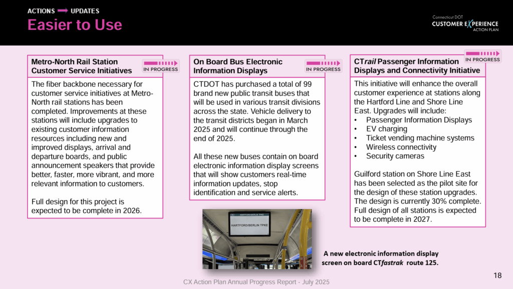 CTDOT has published its second-annual Customer Experience (CX) Action Plan Progress Report (see above). Actions are categorized into three areas: “improved service”; “easier to use”; and “enhanced accessibility and comfort.”