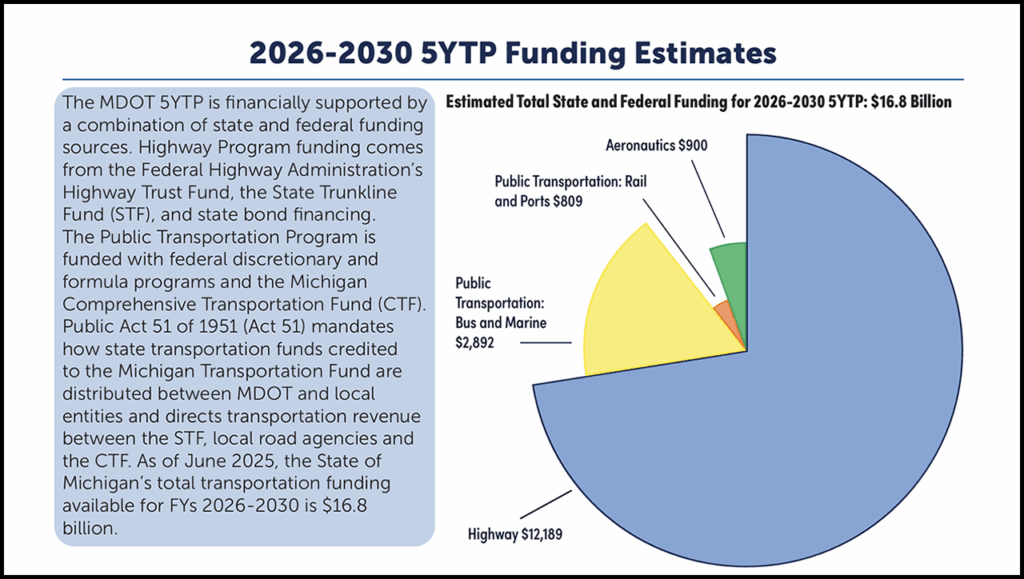 The 5YTP contains a list of planned projects for the MDOT Highway Program (state-maintained roads, bridges and facilities), as well as information on the public transportation, rail, and aeronautics programs, according to MDOT. The document’s aim is to help MDOT connect its long-range goals and strategies for asset management with project programming and monitoring of performance measures and budget targets.