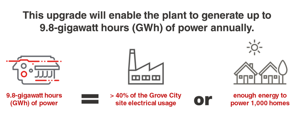 This upgrade will enable the plant to generate up to 9.8-gigawatt hours (GWh) of power annually. It is enough energy to power 1,000 homes. That power generation can be redirected to address more than 40% of the Grove City site electrical usage. It also reduces utility costs by 40%.