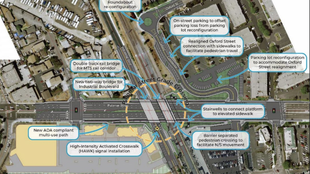 - California — PALOMAR STREET GRADE SEPARATION PROJECT: IMPROVING SAFETY, ACCESS, AND CIRCULATION: San Diego Association of Governments will receive $21.5 million to grade separate an existing street from a rail corridor that serves passenger and freight railroads; right-of-way acquisitions and utilities relocation will also be funded (see map below). The project will reduce emissions by reducing vehicle idling while rail vehicles pass, according to USDOT, and the improved pedestrian and bicycle features will also make the Palomar Transit Center more accessible.