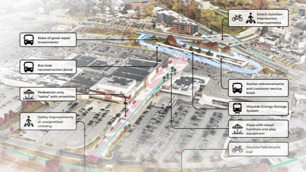 - Maryland — MONDAWMIN TRANSIT HUB PROJECT: Maryland Department of Transportation Maryland Transit Administration will receive $20 million to fund state-of-good-repair investments at the Mondawmin Transit Station: make station enhancements, reconstruct approximately nine intersections with complete streets enhancements, construct a dedicated bicycle trail, improve pedestrian-only right-of-way, make safety enhancements for pedestrian infrastructure ADA upgrades, and make energy storage generation and stormwater management infrastructure improvements (see image below). The project also includes installation of electric vehicle chargers and conversion of hard infrastructure to green bioretention facilities.
