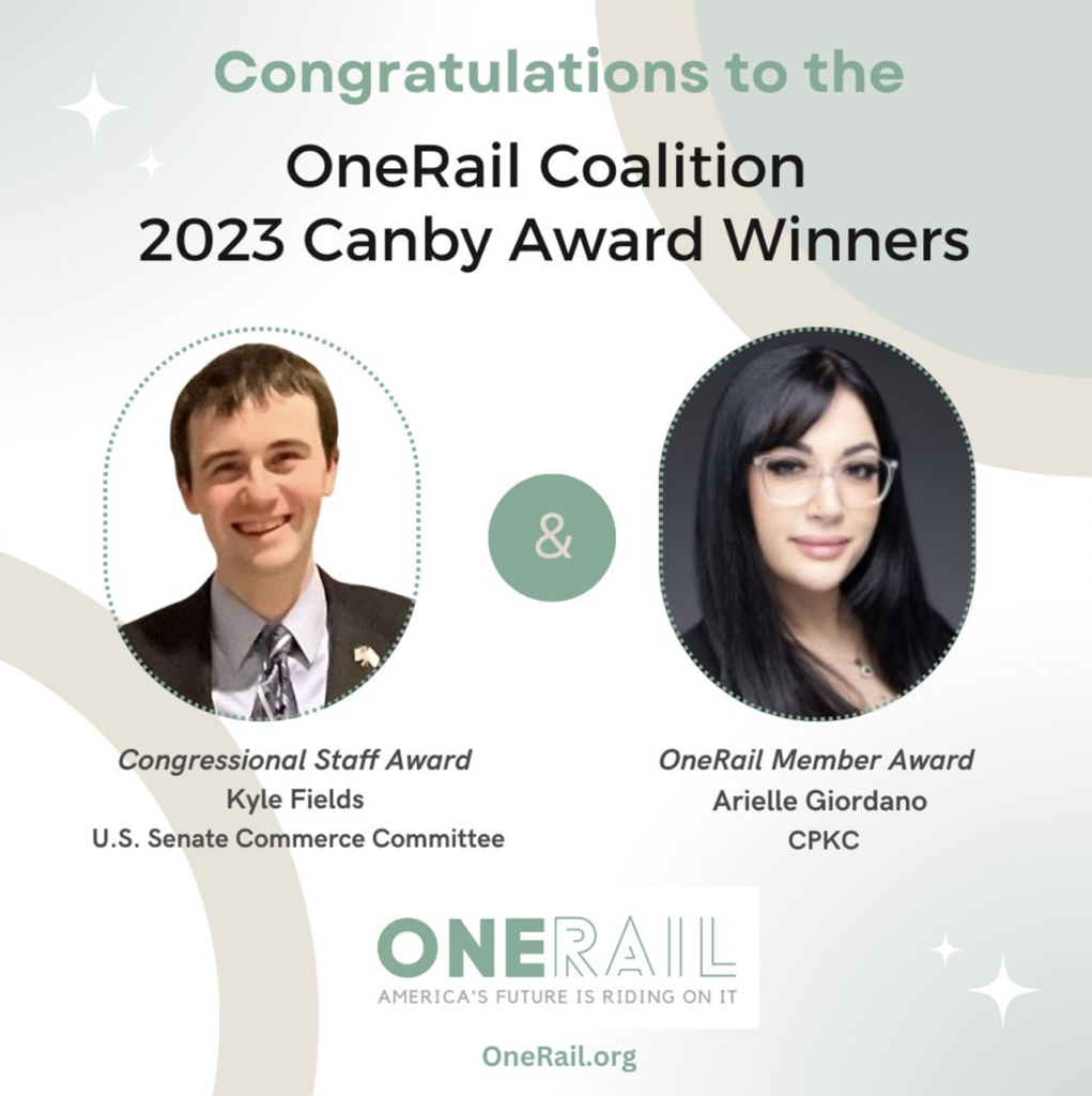 “The OneRail Coalition is pleased to present this year’s Canby Awards to Kyle Fields and Arielle Giordano in recognition of their dedication to preserving and improving the U.S. rail network,” OneRail Coalition Director Devon Barnhart said. “We are grateful for their individual contributions toward strengthening rail across the U.S., which have helped to support our common goal of growing the use of rail, while keeping goods and people moving smoothly.”