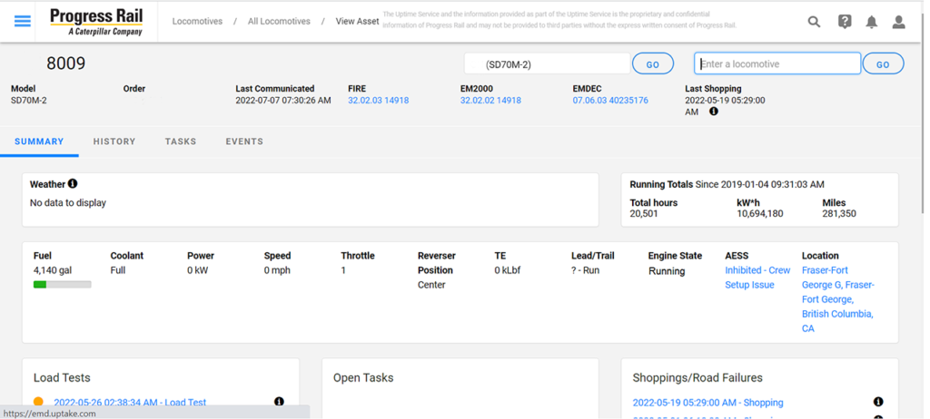 The PR Uptime™ Suite provides railroads with advanced asset monitoring by combining expertise from the company’s Locomotive Monitoring Center (LMC); Uptime Cloud for secure data distribution and storage; Uptime Connect for secure data collection and transmission; and Uptime Analytics to create measurable value in the shop, in the yard and on the track. PR Uptime™ dashboards give locomotive health indicators, locomotive utilization metrics and data that can lead to cost savings. According to Progress Rail, PR Uptime™ has been implemented across numerous fleets, both in the U.S. and internationally, with thousands of locomotives currently being monitored.