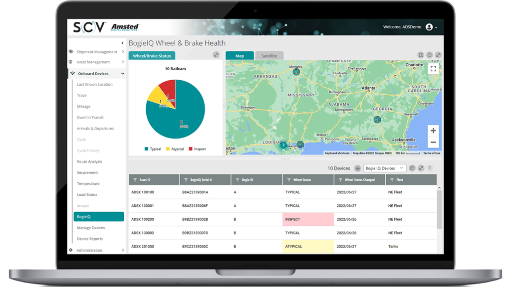 ADS, a subsidiary of Amsted Rail based in Chicago, released in 2Q22 the Bogie IQ™, a global internet of things (IOT) technology focused on freight rail leveraging its SCV™ (Supply Chain Visibility) software, which provides a “quick and easy” means to identify individual railcars within one of three categories: typical, atypical and inspect.