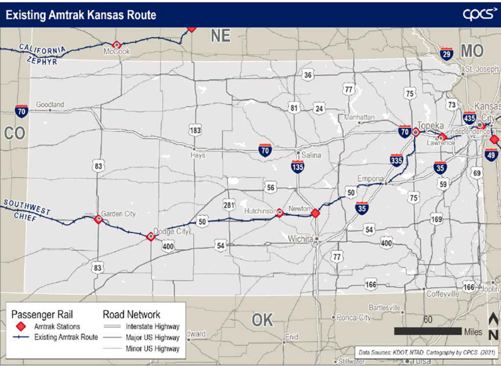 KDOT developed the Kansas State Plan—an update to its 2017 Kansas Statewide Rail Plan—to “guide the state’s vision for railroad transportation and to identify strategies to achieve this vision.” The plan meets federal requirements established under the Passenger Rail Investment and Improvement Act (PRIIA) from 2008 and was prepared by CPCS Transcom Ltd., in association with TranSystems and High Street Consulting Group, and according to KDOT, will “provide a clear understanding of the freight and passenger rail systems; how industries and people use the rail system; and the system needs, issues and opportunities, so KDOT can make better informed policy and investment decisions.”
