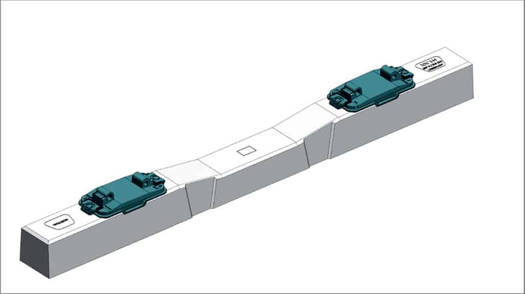 The Keyway Concrete Tie’s stiffness matches timber ties using an advanced approach. By grouping resilient components with heavy-duty ductile tie plates and 10,000 psi concrete ties, the Keyway provides the durability and gauge holding strength of the concrete relations while matching the lower track stiffness and fastening system interchangeability of wood ties. Despite having the longevity of concrete, the Keyway is made with wood tie maintenance infrastructure in mind. It is a similar size to standard timber ties. It is designed to be interspersed with wood ties at strategic intervals using standard maintenance-of-way equipment. The Keyway fastening assembly incorporates gauge adjustability, allowing the tie to be placed in the existing track without gauge adjustment.