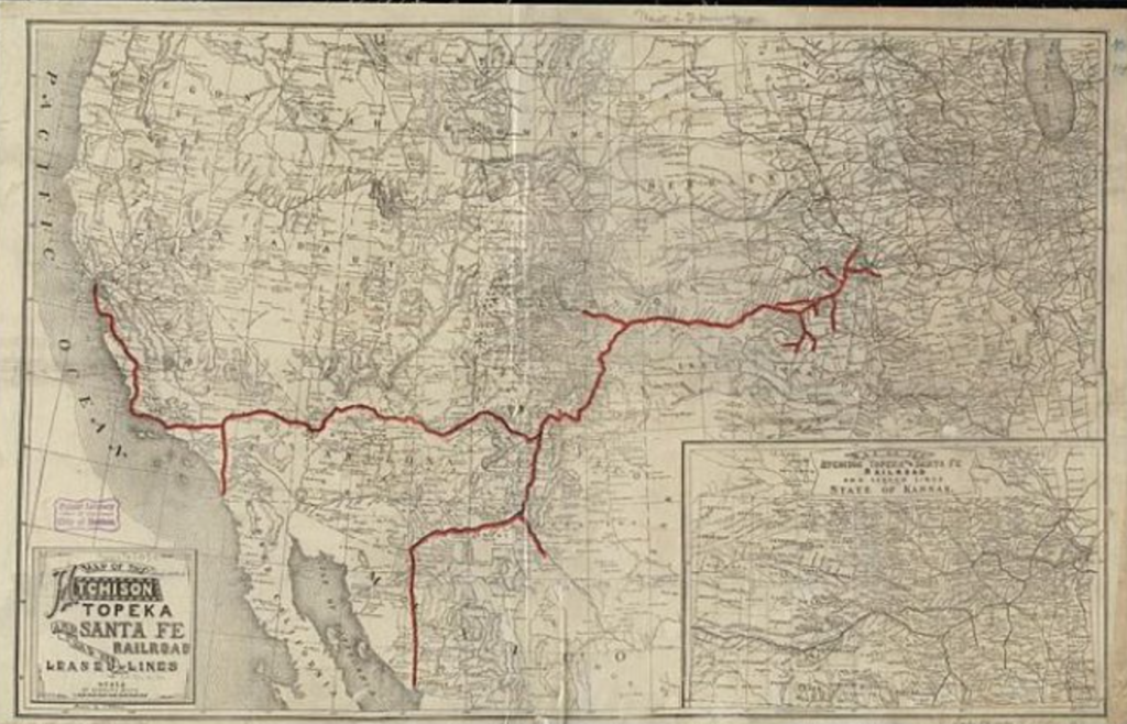 In 1859, the Atchison and Topeka Railroad Company was chartered, and by 1863, the railroad became the Atchison, Topeka & Santa Fe Railway (ATSF) and adopted its iconic nickname, the Santa Fe. It grew to around 9,000 miles by the 1890s.