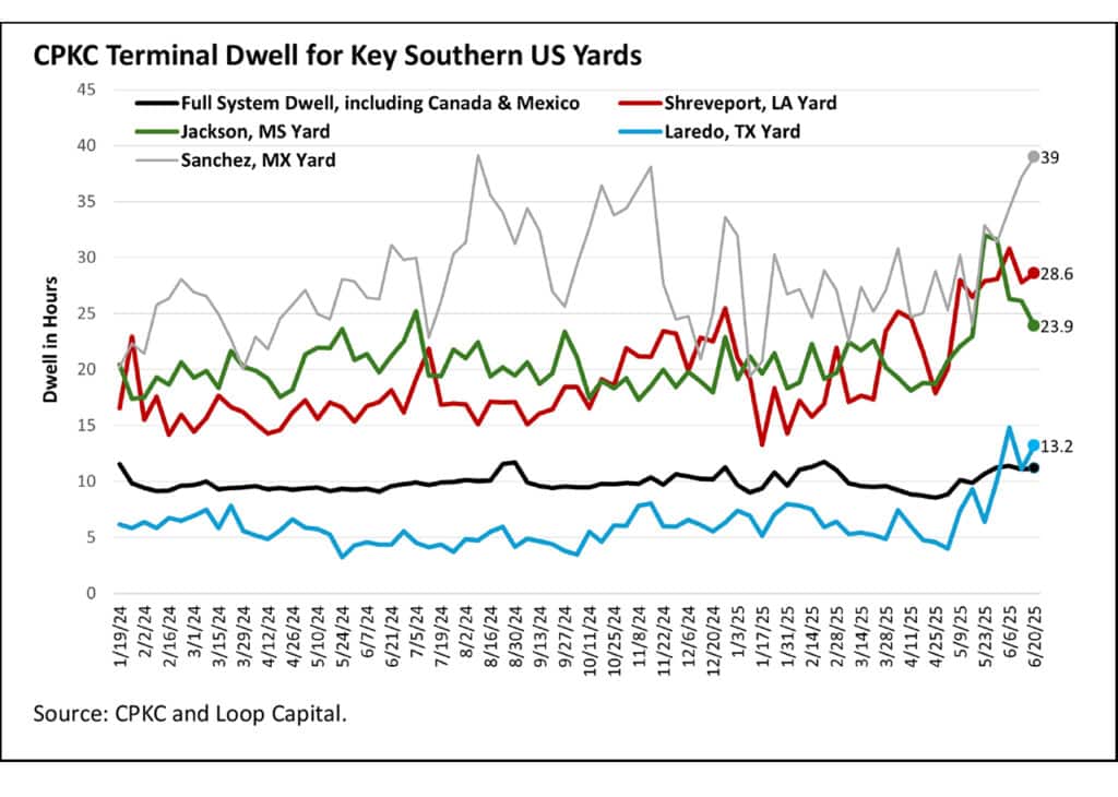 Kansas City remains unaffected, at least in terms of the data, while to the south, Sanchez Yard in northern Mexico deteriorated for a third week, to 39 hours, which is a nine-month high. If we look ever further south, dwell in the week ending June 20 also rose at Monterrey (15-week high) and San Luis Potosi (16-week high). Monterrey is a red flag, because the yard is too small, landlocked within a city, and in a heavily industrialized area requiring extensive local operations. For these reasons it has devolved into a congested mess twice in recent years. CPKC shouldn’t get distracted and take its eye off this ball.