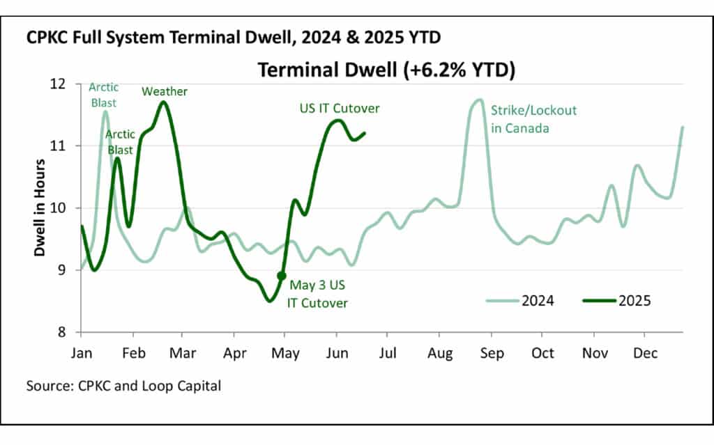 We’ll start as usual with full system terminal dwell (Canada, U.S. and Mexico), with a peak of 11.4 hours in the week ending June 6, followed by an improvement to 11.1 hours through June 13, and then a small backstep to 11.2 last week. An uptick of 0.1 hours (six minutes) is insignificant, but regardless maintains dwell above CPKC’s historically poor benchmark of 11 hours: