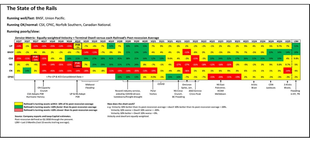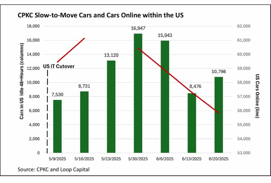 Railroad recoveries are almost always uneven (CSX the recent exception), and we’re seeing that with a mixed bag of data this week regarding CPKC’s efforts to rebound from the operational disruptions from the May 3 cutover of the old KCS Management Control System (MCS) to CP’s TYES system within the U.S. On balance, progress is being made, but we’re not out of the woods yet.
