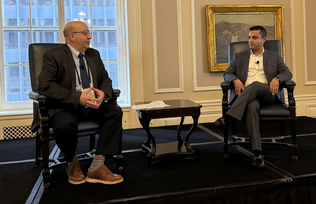 Vantuono with Union Pacific CEO Jim Vena, who takled about the railroad’s improving service and safety metrics. He went into considerable detail about Precision Train Builder, a platform developed by UP subsidiary PS Technology for train consist makeup. Vena also candidly commented on the recent public statements issued by the STB and FRA on safety.The event included a luncheon recognizing the 2024 honorees of Railway Age’s “Fast Trackers” 25 Under 40 awards.Railway Track & Structures Editor-in-Chief David Lester (left) with CN Vice President Engineering and RT&S 2023 Engineer of the Year Brent Laing.Genesee & Wyoming President and CEO Michael Millerdiscussed how “People Matter Most” with Railway Age Senior Editor Carolina Worrell.G&W railroads collectively have led the short line industry in safety since the early 2000s, and have also received more than 1,000 Jake Awards with Distinction from the American Short Line and Regional Railroad Association. These are both “tremendous accomplishments, considering that short line railroads handle significantly more switching and short line employees move on and off rail equipment considerably more than Class I railroaders,” he noted.Vantuono (left) with Norfolk Southern AVP Enterprise Data & Analytics Mabby Amouie, who explained NS’s collaboration with the Georgia Tech Research Institute (GTRI) on Digital Train Inspection Portals to enhance rail safety across the Class I railroad’s 22-state network. The portals feature cutting-edge Machine Vision Inspection technology; GTRI engineered the hardware, and NS’s Data Science/Artificial Intelligence (AI) and Mechanical teams “built the brains behind the program.”The Digital Train Inspection Portals are equipped with an array of 24-megapixel trackside cameras and stadium lighting. Together, this Machine Vision Inspection technology captures ultra-high-resolution, 360-degree images of passing railcars. The cameras are synced to the microsecond, taking 1,000 images per railcar on average as they pass through the tunnel at speeds up to 70 mph. The high-speed cameras are strategically placed at angles to capture things that are difficult to detect with the human eye during stationary inspections. In addition, capturing images while the train is in a dynamic state provides an inspection for various defects that cannot be done while the train is stationary.Tracy Robinson (right), President and CEO of CN and Railway Age’s 2024 Railroader of the Year, engaged in a “fireside chat” with Railway Age Editor-in-Chief William Vantuono (left) and discussed how the North American supply chain is changing, as well as its growth opportunities.Railroads have long-term physical assets (locomotives, rolling stock, track, signals, etc.) and fixed infrastructure—lots of sunk investment. Transportation market dynamics and supply chains are constantly shifting, evolving. It’s a tough balance. Robinson elaborated on how CN is addressing this. Robinson also discussed climate change and its impact on railroads. In recent months, the climate has continued to take wild swings, and all over North America we’ve seen blizzards, wildfires, bomb cyclones and tornados, sometimes in the same area, and not very far apart. In Chicago, for example, the temperature shot up about 40-50 degrees (F) from freezing and then nosedived the next day back down to freezing. How does a railroad prepare for that? Respond and recover? What lessons have been learned from dealing with these conditions?Railway Age and Railway Track & Structures Publisher Jonathan Chalon (left) and Railway Age Editor-in-Chief William C. Vantuono (right) presented Tracy Robinson, President and CEO of CN, with Railway Age’s 2024 Railroader of the Year award.Railway Age Senior Editor Carolina Worrell (left) and Railway Age Executive Editor Marybeth Luczak (right) attend the Railroader of the Year dinner honoring CN President and CEO Tracy Robinson.