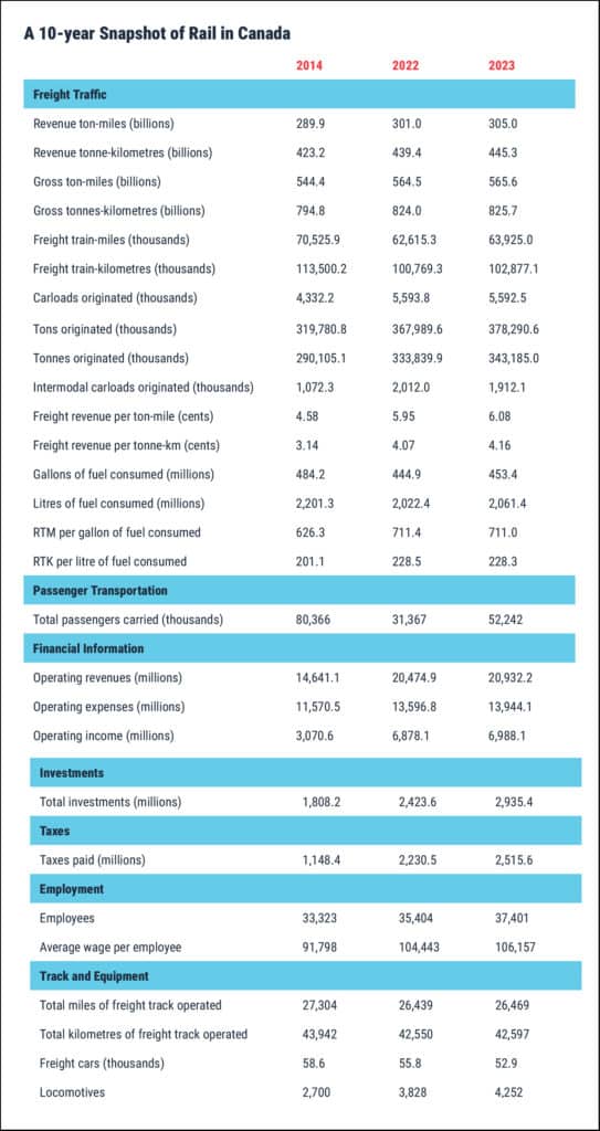The Railway Association of Canada (RAC) has released Rail Trends 2024, the 32nd edition of its rolling ten-year review of the industry’s financial and statistical performance. The information is a compendium of Canadian rail data up to Dec. 31, 2023 from RAC members: Class I freight and short line railways, and tourist, intercity and commuter passenger railways.