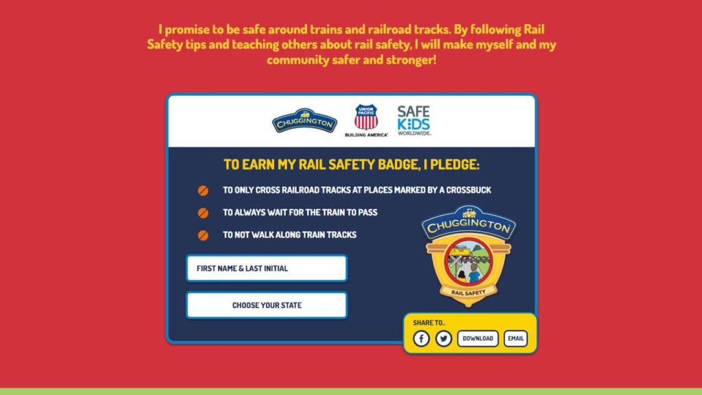 “Every five days a child is killed in a train collision but there are proven steps communities and parents can take to protect their children,” said Torine Creppy, President of Safe Kids Worldwide. “We’re thrilled to join Union Pacific and Chuggington during Rail Safety Week to raise awareness, provide lifesaving resources, and encourage all parents to talk to their kids about railroad safety and to model safe behavior themselves.”