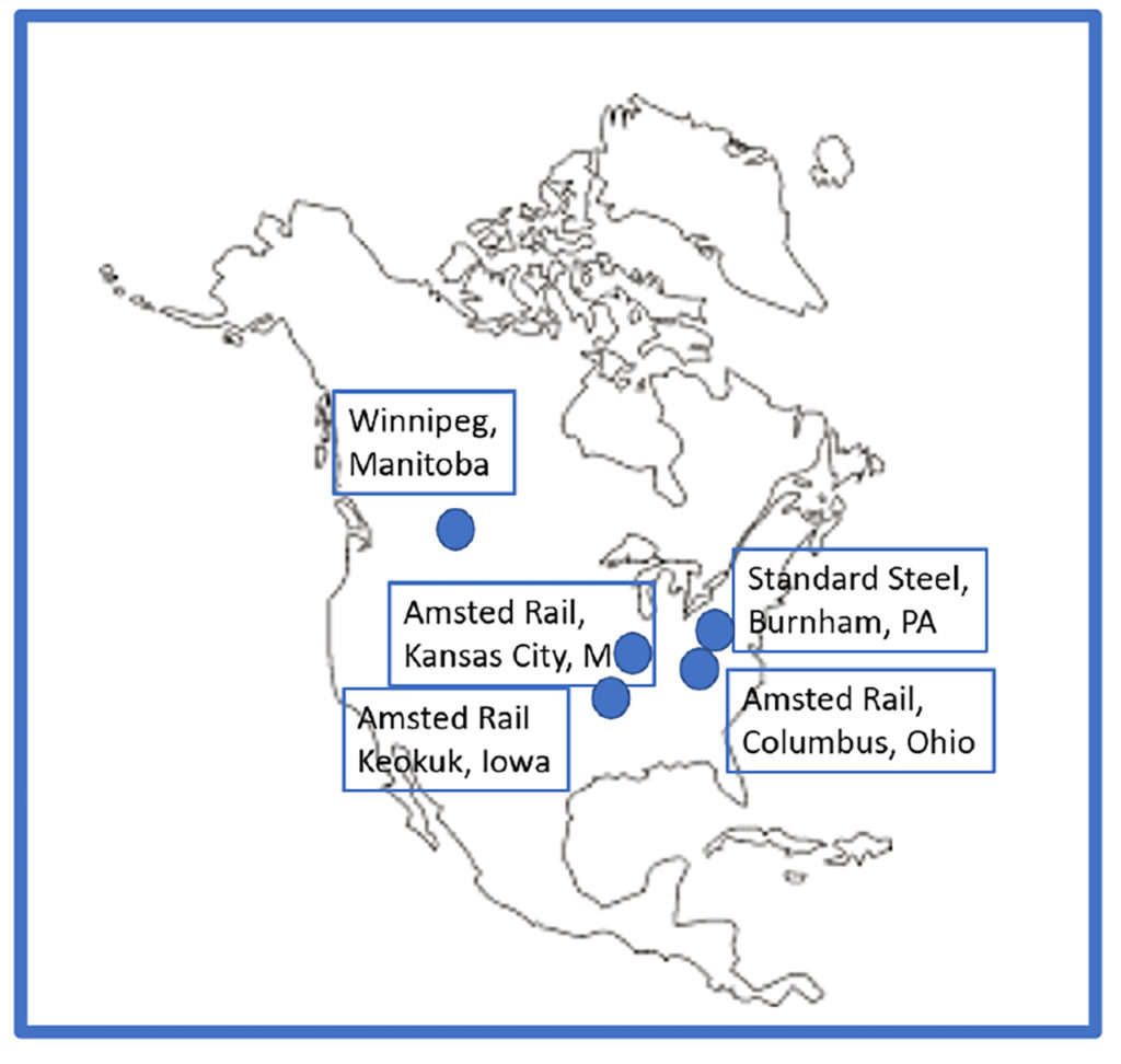 North American wheel plants: Amsted Rail has 4 North American wheel plants. They’re located in Columbus, Ohio; Kansas City, Mo., Keokuk,Iowa; and Winnipeg, Canada. In addition to being diversified geographically, combined, theese plants have the ability to serve the entire North American rail industry during normal times.