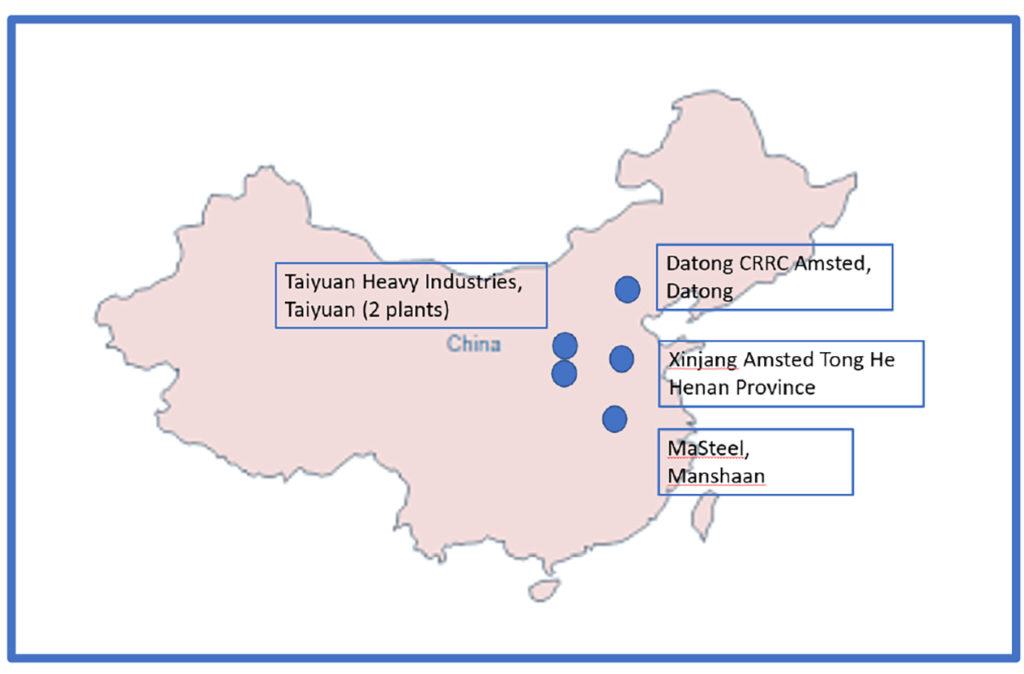 Chinese wheel plants: Of the 5 Chinese AAR-certified wheel plants, 2 are joint ventures with Amsted Rail to supply wheels exclusively to the Chinese market. The joint ventures were established more than 30 years ago to introduce modern wheel technology to China. Since then, 3 other Chinese wheel plants have been constructed: Taiyuan Heavy Industries (2 plants) and Maanshan Steel, both SOEs (state-owned enterprises). The Taiyuan Heavy Machinery Group Co. was founded in 1950 as the first state-owned heavy machinery company, designed and constructed by the government since the founding of the People’s Republic of China in 1949.