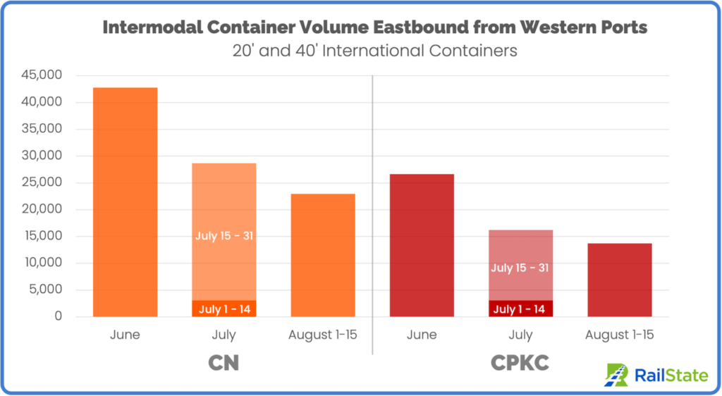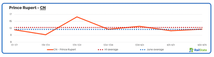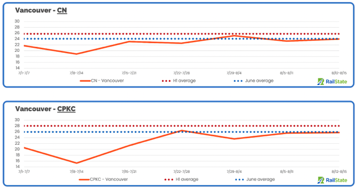 Total train traffic through the Port of Vancouver is in line with pre-strike traffic, according to RailState. Train volume on CN increased over the June average in early August, which would help clear some of the backlog. This increased volume, however, has not been sustained.