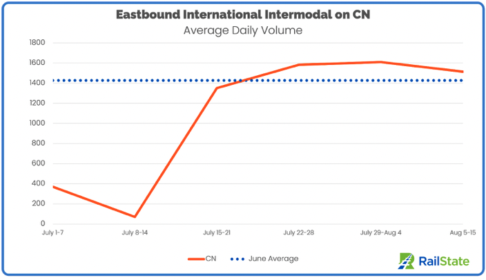 And within two weeks, CN increased intermodal traffic to above the historic average and has maintained that elevated volume into August. CN is moving 103 more containers per day than in June (7.2% increase), which is about one extra intermodal train every other day.