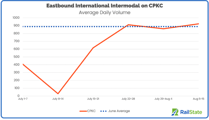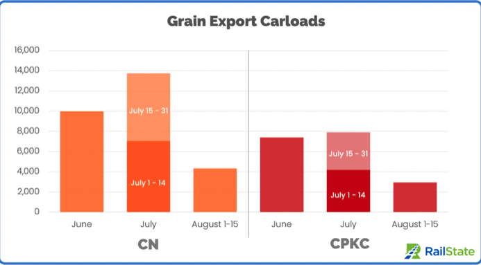 CPKC lost coal traffic during the strike and has now returned to pre-strike volumes. Export carloads on CPKC are in line with volumes moved during June, with just a modest difference of a 2.4% higher daily average rate in August so far.