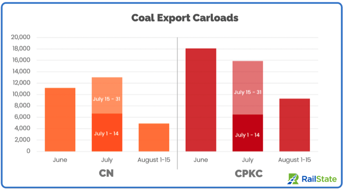 The average daily rate for coal export carloads on CN through the first half of August is down 22.4% from July and still down 12.3% from June volumes.