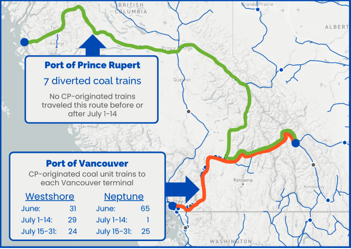“RailState is the only data source that identified these diverted trains and the route taken from southeast BC to the Port of Prince Rupert,” the company said. No coal unit trains moved on this route in the previous year or since the end of the main strike period on July 14.