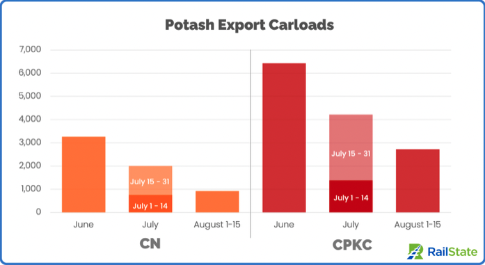 Potash exports decreased significantly during the work stoppage and have not recovered like other commodities, according to RailState. Daily average volume is down 43.2% from June volumes on CN, and down 15.2% on CPKC. There are a couple factors impacting the drop in Potash exports, according to RailState. One is the lower potash volumes compared to other commodities. One additional train movement in a week could significantly change the volumes seen so far in August. More importantly, RailState says, “a major potash producer has curtailed production in response to general demand.”
