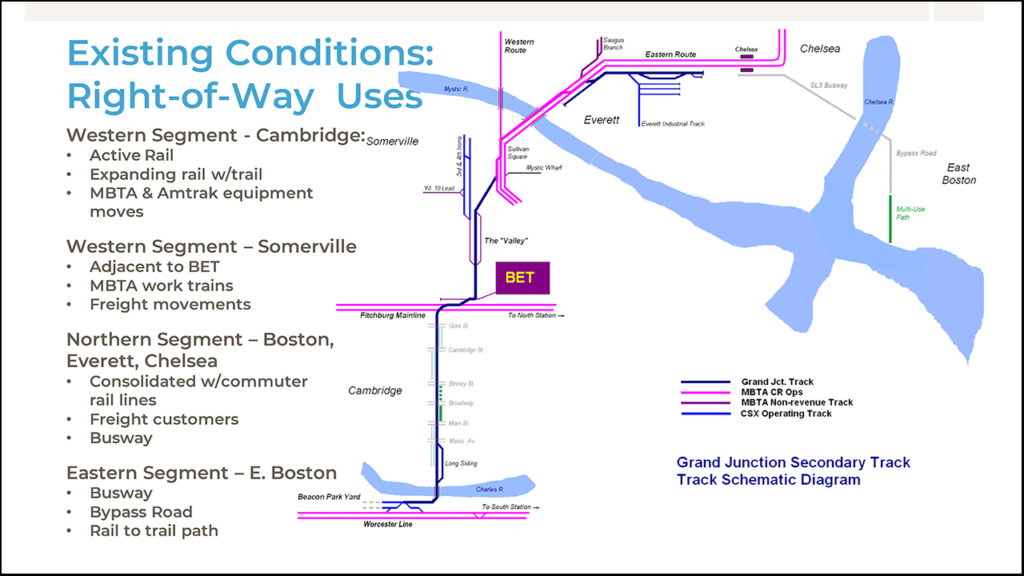 The Thursday session lasted until late in the morning and included two presentations before the closing panel. The first came from Rachel J. Burkhardt, a Boston-based Assistant Vice President and Senior Project Manager for WSP USA and focused on the MTBA’s Grand Junction Rail Study. Grand Junction is the connection point between the former Boston & Albany Railroad (B&A) and North Station, the hub for Northside service on the MBTA (the “T”) and Amtrak’s Downeaster trains to Portland and Brunswick, Maine. The former B&A line hosts trains on the T to Framingham and Worcester and the Massachusetts section of Amtrak’s Lakeshore Limited, all of which now terminate at South Station. The junction is used occasionally for equipment moves, but proposed full-service use could add flexibility.