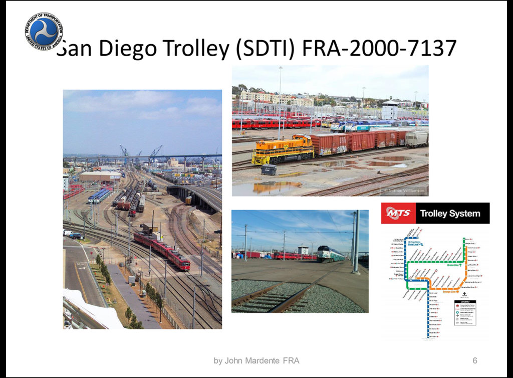 John Mardente of the FRA Office of Safety, Assurance, and Compliance gave a detailed presentation on those topics and associated best practices. He started by saying that he had spent 20 years at the agency but had started with New York City Transit. For a shared-track operation with freight and rail transit, he stressed the need for waivers, and for a Memorandum of Understanding (MOU) that clarifies exclusive blocks of time for the freight and passenger operations. He then explained several varieties of temporal separation operations, with examples of each. He said that petitions for shared-track operations must be specific, and that railroad people know what is needed. He added that the River Line in South Jersey is a complicated arrangement, with NJT running the rail transit and Alstom running the freight side under NORAC rules. He concluded by saying that safety is not negotiable, and that all petitions to the FRA Safety Board for waivers are different. He did say that “Alternate Vehicle Technology” under 49 C.F.R. Part 238 could allow some transit operations on shared track, including TEXRail in Fort Worth and the Arrow trains between Redlands and San Bernardino, California (where some connect with Metrolink).