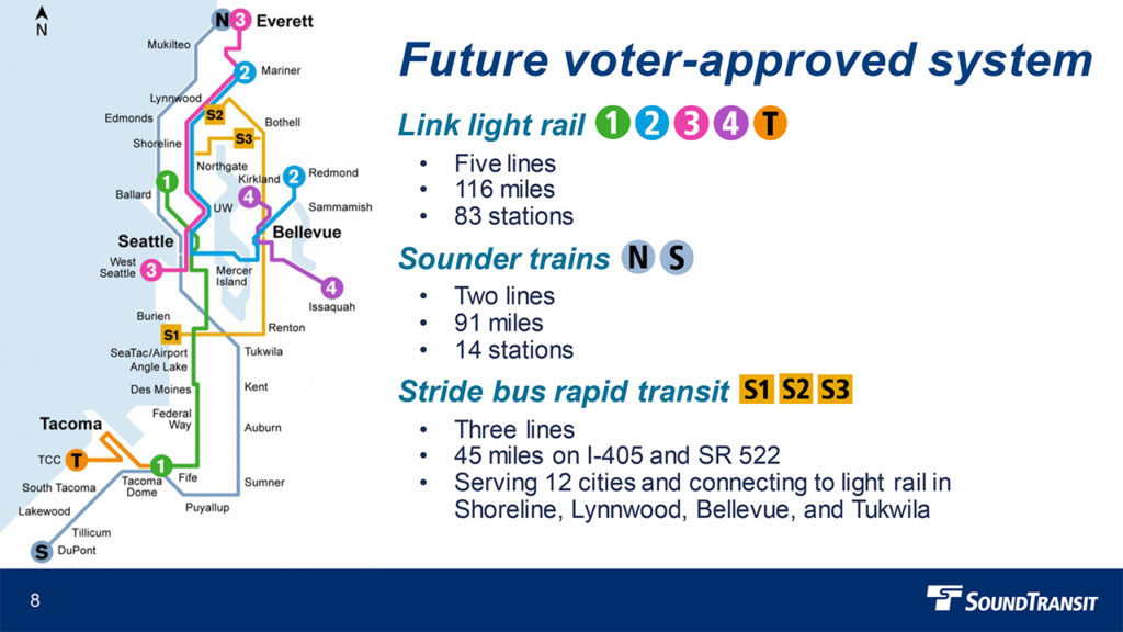 The final presenter before the closing panel was Suraj Shetty, Executive Director of Operations for Sound Transit, who focused on the agency’s Light Rail Expansion Program in the Seattle area. He started by describing the three counties in Sound Transit’s service area: Snohomish (north of Seattle, including Everett), King (the city of Seattle), and Pierce (south of Seattle, including Tacoma). He said that 40% of Washington State’s population lives there, and that the three counties also run their own transit systems within county borders. Sound Transit started by building and running light rail between downtown Seattle and SEA-TAC Airport, added Sounder trains north of Seattle to Everett and south to Tacoma and Lakewood, then added intercounty buses, and later expanded those service lines. There are plans to add three more “Link” light rail lines and extend Sounder trains both north and south by 2044.