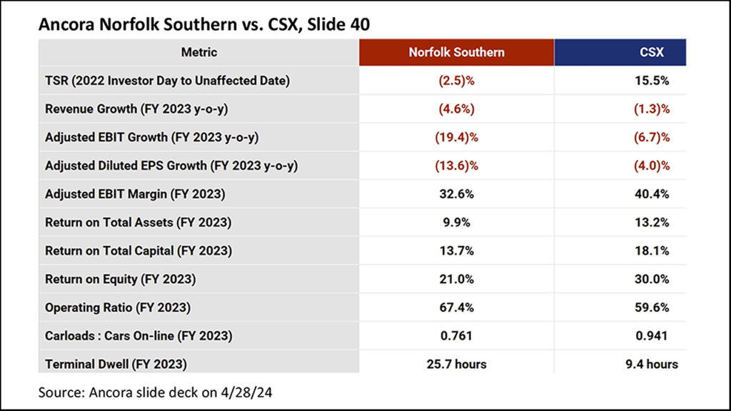 Given that we write a weekly report on railroad operating metrics, we’ll focus on, and fact check, some of the operating metrics Ancora is presenting to investors, specifically when they compare Norfolk Southern to its regional competitor, CSX.