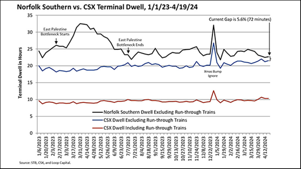 Let’s keep going and continue with the analysis Ancora should have done. 2023 is history, so where are we in 2024? In the week ending April 19 (most recent data), CSX’s STB dwell was 21.5 hours vs. 22.7 hours at NS. That’s a 5.6% difference (72 minutes of dwell) in CSX’s favor, and light years from the 173% differential in the slide deck.