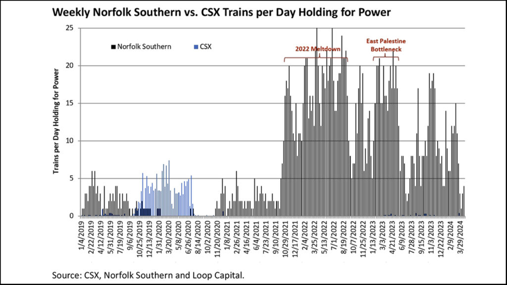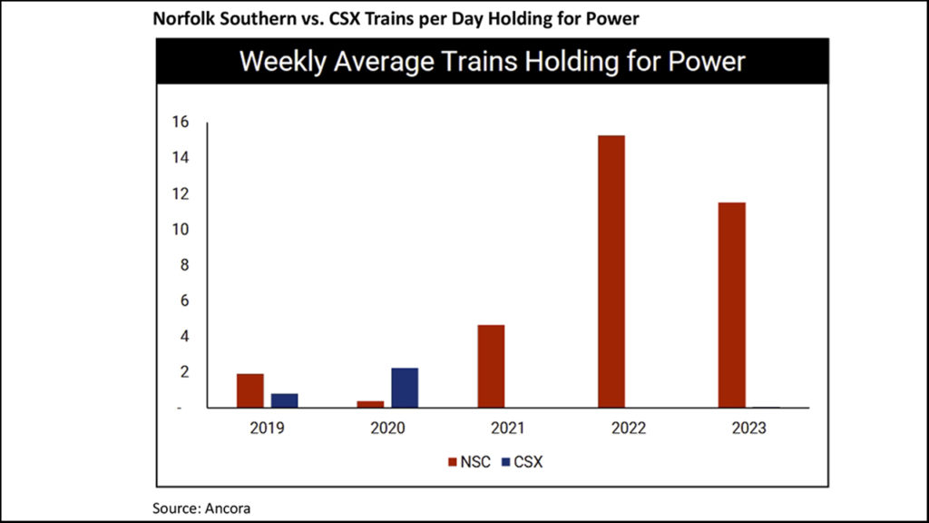 The historical rule of thumb for trains holding for power (and separately, crews) for the two Eastern railroads is that anything 10 or over per day is bad (short power), anything under five per day is good (long power), and 5-9 is in the grey area. Ancora’s chart shows NS at two per day in 2019, 0.5 in 2020, five in 2021, 16 in 2022, and 12 in 2023. CSX’s numbers are 0.9 per day in 2019, 2.1 in 2020, and virtually nothing since.