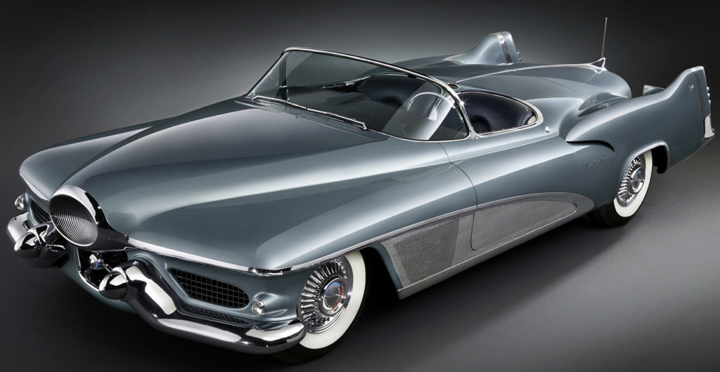 My hunch is there’s a subliminal infusion of mid-20th-century American swagger in the Bernina design, specifically the influence of Harley Earl, then head of the General Motors Art Department. His 1951 dream car, the Le Sabre, brought jet fighter plane glamor to post-war American automobiles (completely ignoring railroads, by the way), and helped introduce the tailfin and the wraparound windshield, curved at either end. A popular European panorama car has tall, straight-up windows surmounted by a second, small “eyebrow” window, or transom window, set at a slant into the car’s roof.