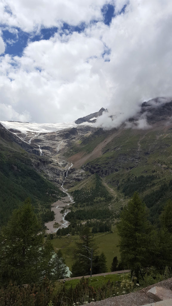 Just outside St. Moritz, the train skirts the Stazerwald, a forested park and nature sanctuary, and just beyond, a hiking and bike path parallels the train in front of dense stands of long-lived, aromatic, dark-green Swiss stone pine and tall, stately larch, whose needles turn golden and are shed in the fall. The bleak, stark, rocky sweep of the summit is itself above the tree line. The views just beyond the Bernina Pass summit—to one side, a glimpse of the long valley leading down and down and down to Italy, and on the other, an Alpine meadow that stretches up toward the ancient Palü Glacier, retreating but still formidable. The glacier, crouched on a high peak, trails a distinct, white meltwater stream that dives across the meadow in a long line of cascading waterfalls you can trace with an outstretched finger.