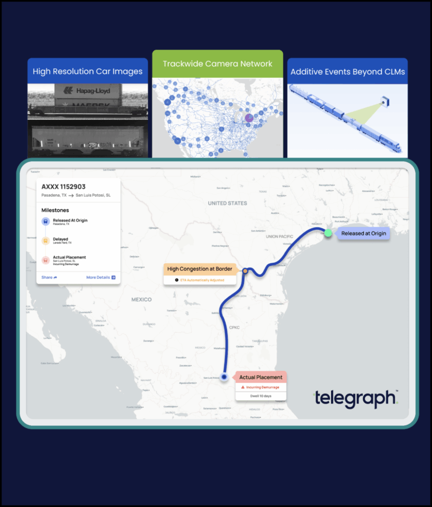 Telegraph’s integrated rail platform—including carload and intermodal shipment tracking and real-time rail equipment monitoring; reporting and analytics; and pricing and booking—provides the freight rail data needed for “proactive business intelligence and decision-making,” they explained. “RailState’s trackside camera network contributes additive events beyond standard CLMs [car location messages], as well as high-resolution car images of shipments enroute.” This allows shippers to spot network anomalies, such as delays, congestion, or unexpected routing, according to the companies.