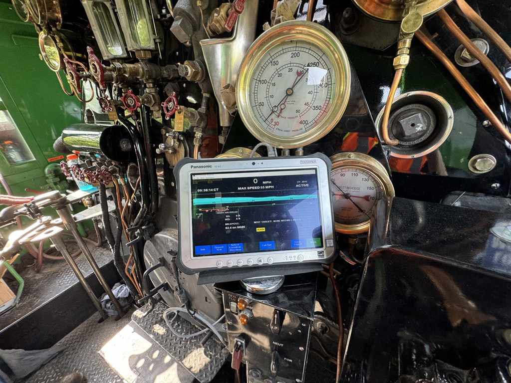 The photo above of Canadian Pacific Kansas City Manager Operating Practices, Steam Heritage Operations Jonathan J. Morris in the engineer’s chair in CP 4-6-4 H-1b 2816, the fabled and famous Empress, could have been taken in the 1930s. Morris is checking a traditional railroad time-keeping device, a pocket watch, to ensure an on-time departure. But look closely below the array of beautiful, polished brass gauges and you’ll see a 21st-century digital PTC display.