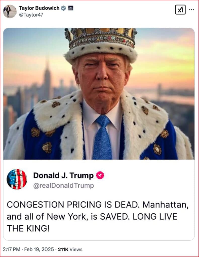 Referencing POTUS 47’s tweet on his Truth Social platform in which he trumpeted “CONGESTION PRICING IS DEAD. Manhattan, and all of New York, is SAVED. LONG LIVE THE KING!” Hochul said, “We are a nation of laws, not ruled by a king. The MTA has initiated legal proceedings in the Southern District of New York to preserve this critical program. We’ll see you in court.”