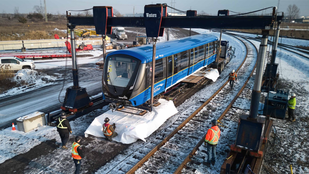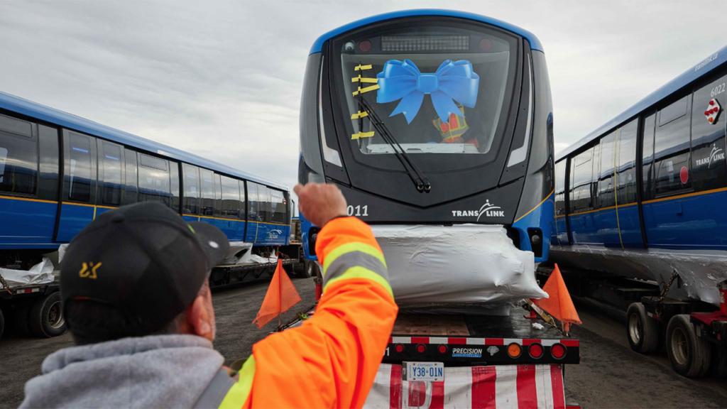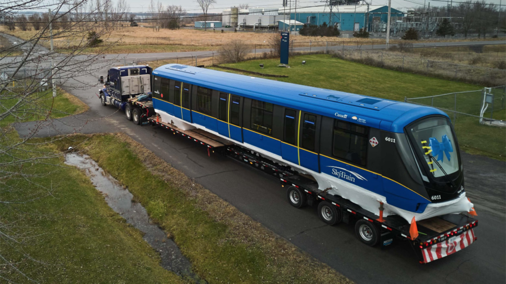 Following functional performance testing at Alstom’s Kingston, Ont. plant, the first Mark V SkyTrain set is en route on flatbed trucks to Vancouver, B.C. Upon arrival in Burnaby, the trainset will undergo testing that will last through most of 2024.