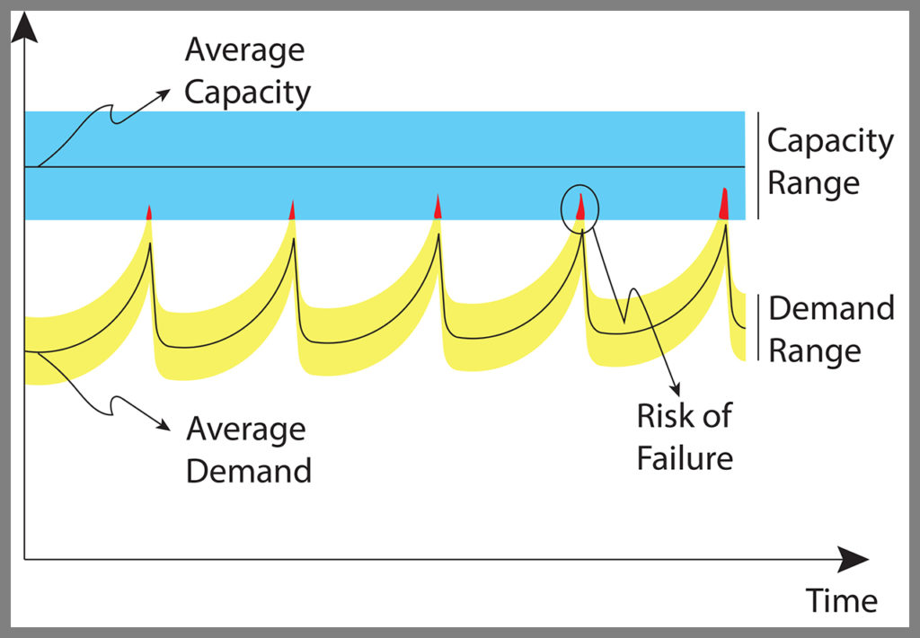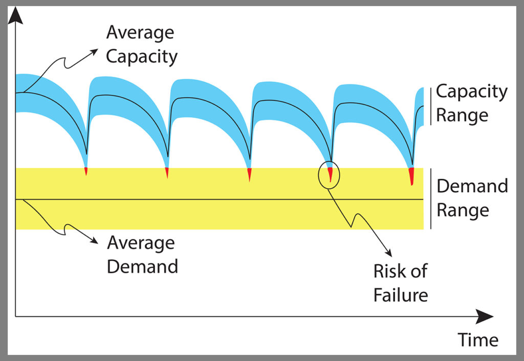 It is very important to note that both figures contain risks of failure, even though, at all times, the average capacities remain well above the average demands. The takeaway is this: The only reliable means to keep risks of failure within acceptable limits are to control simultaneously the lower reaches of capacity and the upper reaches of demand, and those are quite often independent from one another.