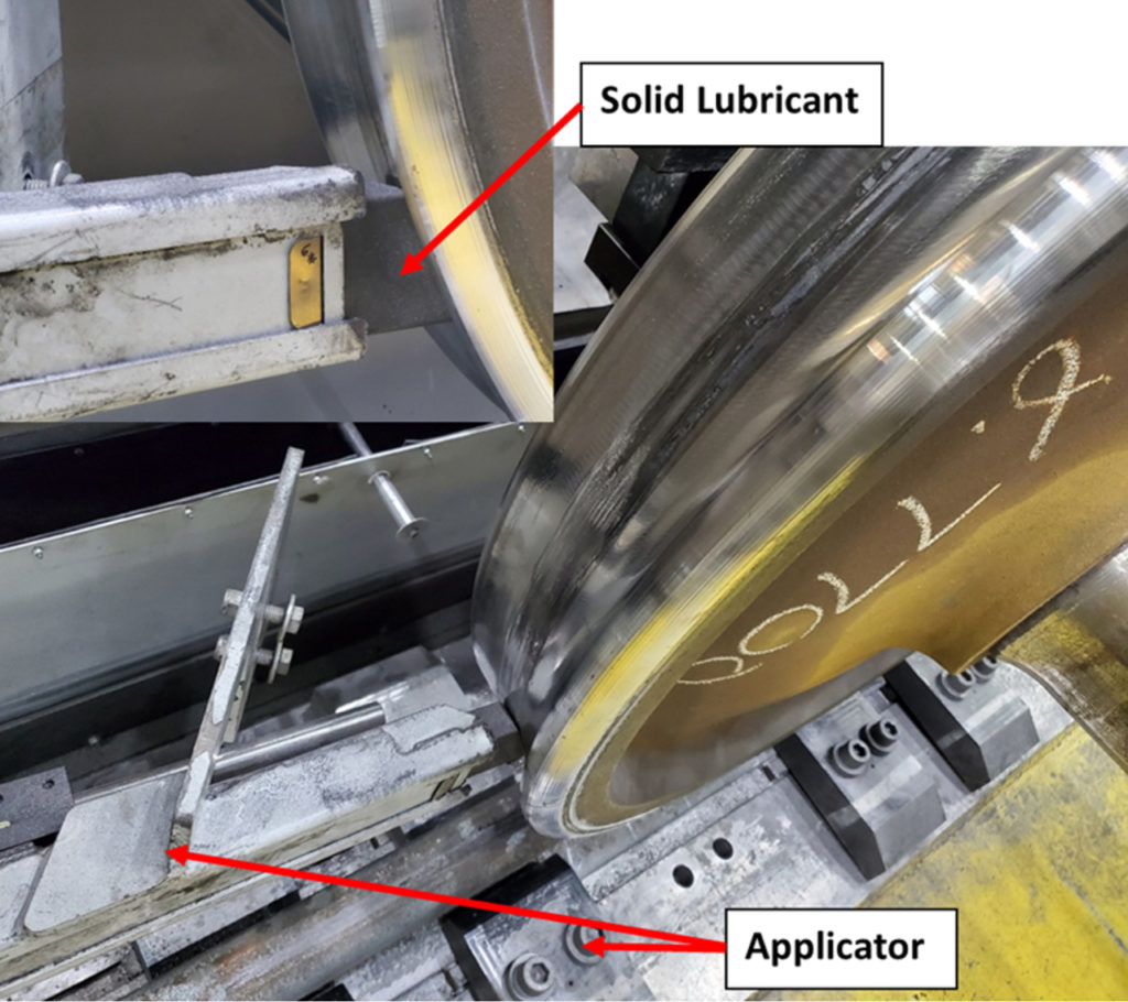 The RCFS has the unique ability to perform lubrication studies with full-scale W/R rolling contact that permits the observation of surface damage along the entire surface of the rail head and a portion of the wheel tread surface. The simulator also allows the study of the use of lubricants in controlled amounts during actual W/R interaction, which is usually difficult to control precisely on tracks in revenue service due to wayside lubricating systems.