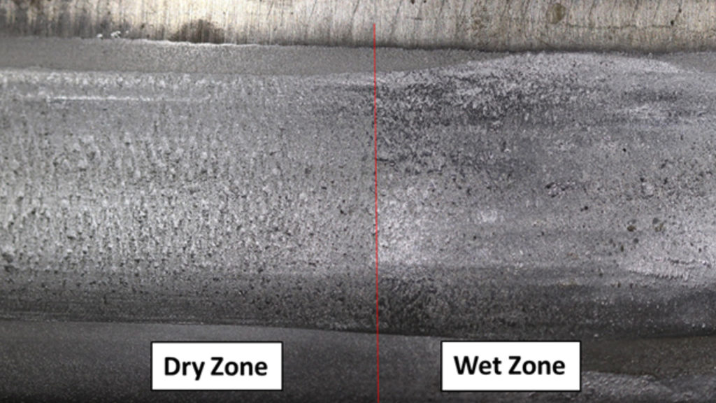 The 10-inch test zone was conditioned into two different levels of friction: a dry surface condition with no lubricant in the first half of the rail and a wet surface condition with water applied between the center and the end of the rail (Figure 1, above). During testing with a commercial solid lubricant, the dry, unlubricated contact zone had a traction ratio of 0.40 to 0.50, and the lubricated zone had a controlled traction ratio of about 0.20 to 0.25. The same wheelset was used for all tests, but rotated to expose an unworn portion of the tread for each additional test condition.